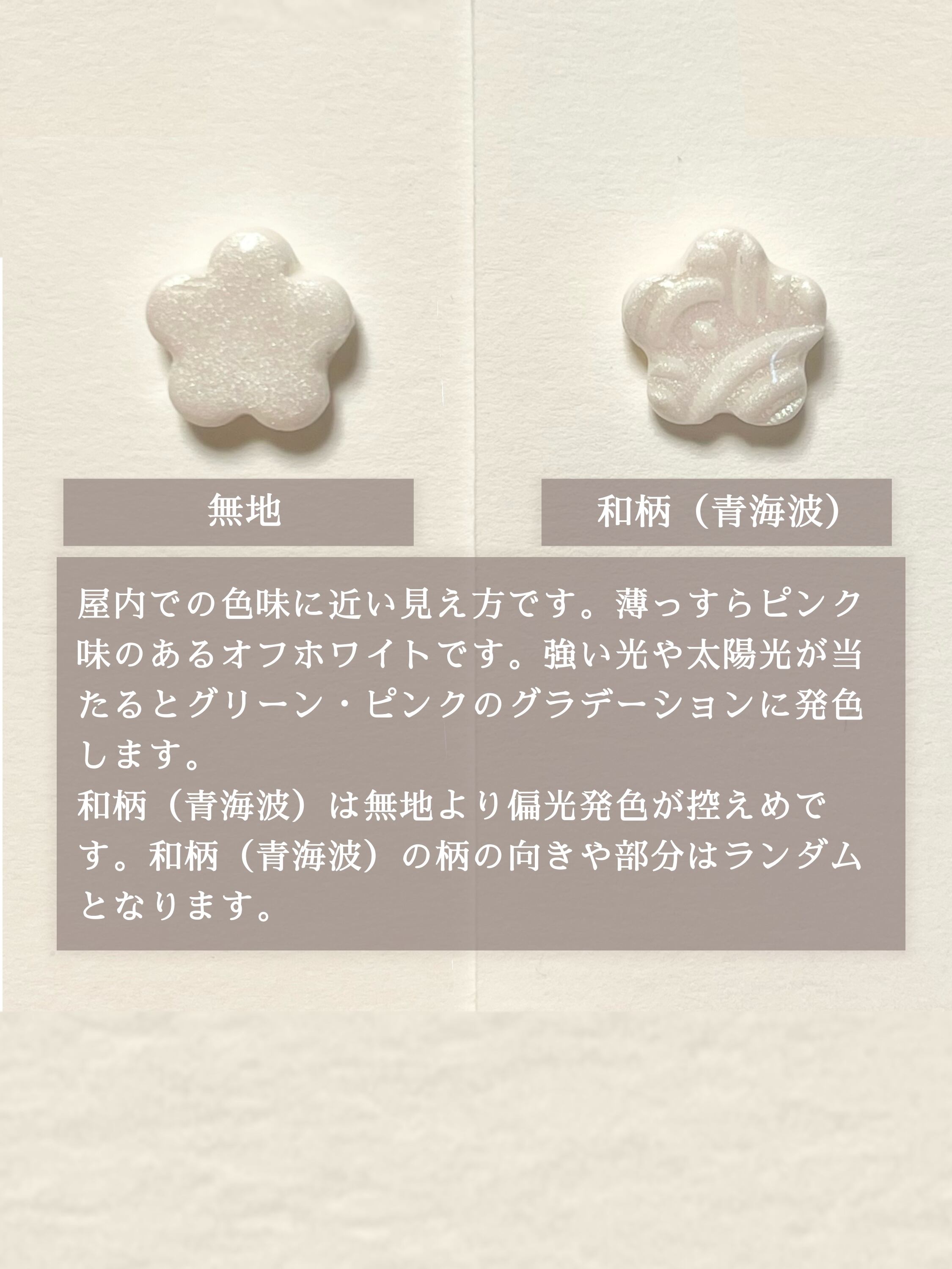微細な偏光染料 を用いたグラデーションが光の角度によりホワイトからグリーン、ピンクへと美しく移ろい、耳元を彩ります。表面にはレジンコーティングを施し、濡れたような艶やかな質感です。軽量で長時間着けても耳に負担がかかりにくいので、デイリー使いにも最適。